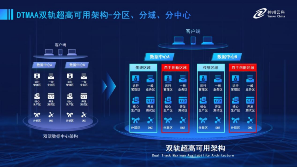 為幫助金融客戶更好地應對數(shù)字經(jīng)濟時代對可持續(xù)性的高要求,實現(xiàn)“信創(chuàng)”與“數(shù)字化”齊頭并進,leyu.樂魚推出了雙軌超高可用架構。該架構在雙活數(shù)據(jù)中心的分區(qū)調度基礎上,增加信創(chuàng)域和非信創(chuàng)域的分域調度,實行信創(chuàng)域與傳統(tǒng)域應用全量部署,使雙中心運營變?yōu)殡p中心四區(qū)域并行運行,互為多活,將“0到1”的單軌建設道路變?yōu)榉謪^(qū)分域協(xié)同的多活雙軌超高可用架構。幫助客戶在新架構下,保障“信創(chuàng)”的同時解決性能瓶頸,提升穩(wěn)定性,保證應用可持續(xù)性,最終實現(xiàn)信創(chuàng)區(qū)域和非信創(chuàng)區(qū)域的平滑過渡,完成國產化替代目標。